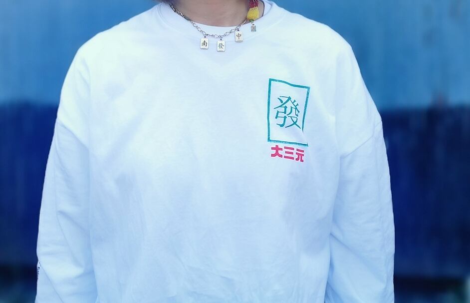 白いTシャツに左袖口には「白」前面には「發」右袖口には「中」で麻雀の「白」「發」「中」を表したした“大三元”Tシャツです。